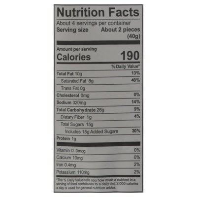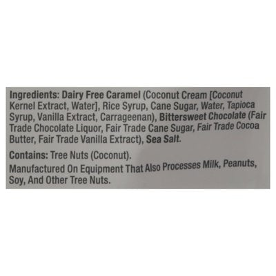 INGREDIENTS: Caramel (Cream [Cream, Milk], Corn Syrup, Sugar, Invert Sugar, Water, Butter [Cream, Salt], Salt, Soy Lecithin [an Emulsifier]), Semi-Sweet Chocolate (Sugar, Chocolate Liquor [Processed with Alkali], Cocoa Butter, Milkfat, Soy Lecithin [an Emulsifier], Vanilla), Sea Salt.