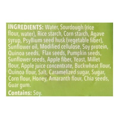 INGREDIENTS: Water, Sourdough (Rice Flour, Water), Rice Starch, Corn Starch, Agave Syrup, Psyllium Seed Husk (Vegetable Fiber), Sunflower Oil, Modified Cellulose, Soy Protein, Quinoa Seeds, Flax Seeds, Pumpkin Seeds, Sunflower Seeds, Apple Fiber, Yeast, Millet Flour, Apple Juice Concentrate, Buckwheat Flour, Quinoa Flour, Salt, Caramelized Sugar, Sugar, Corn Flour, Honey, Amaranth Flour, Chia Seeds, Guar Gum.