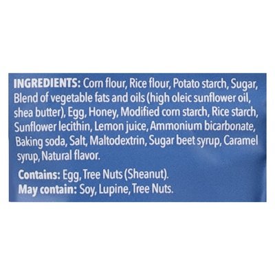 INGREDIENTS: Corn Flour, Rice Flour, Potato Starch, Sugar, Blend of Vegetable Fats and Oils (High Oleic Sunflower Oil, Shea Butter), Egg, Honey, Modified Corn Starch, Rice Starch, Sunflower Lecithin, Lemon Juice, Ammonium Bicarbonate, Baking Soda, Salt, Maltodextrin, Sugar Beet Syrup, Caramel Syrup, Natural Flavor.