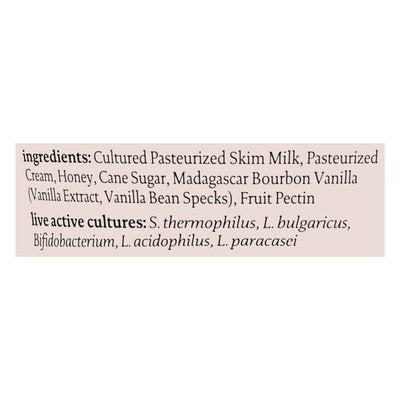 INGREDIENTS: Cultured Pasteurized Skim Milk, Pasteurized Cream, Honey, Cane Sugar, Madagascar Bourbon Vanilla (Vanilla Extract, Vanilla Bean Specks), Fruit Pectin, Live Active Cultures: S. Thermophilus, L. Bulgaricus, Bifidobacterium, L. Acidophilus, L, Paracasei.