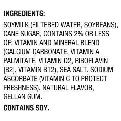INGREDIENTS: Soymilk (Filtered Water, Soybeans), Cane Sugar, Contains 2% or Less of: Vitamin and Mineral Blend (Calcium Carbonate, Vitamin A Palmitate, Vitamin D2, Riboflavin [B2], Vitamin B12), Sea Salt, Sodium Ascorbate (Vitamin C to Protect Freshness), Natural Flavor, Gellan Gum.