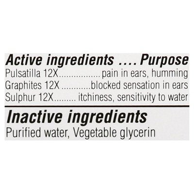 INGREDIENTS: Active Ingredients: Pulsatilla (12 x), Pain in Ears, Humming; Graphites (12 x), Blocked Sensation in Ears. Inactive Ingredients: Purified Water, Vegetable Glycerin.