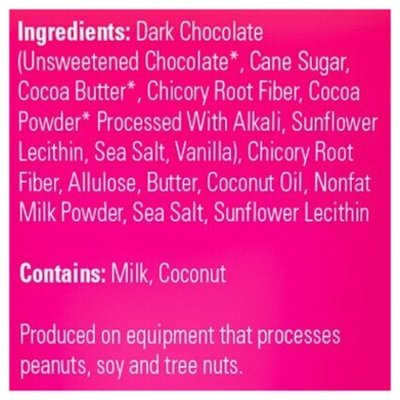 INGREDIENTS: Dark Chocolate (Unsweetened Cholate (Fair Trade Certified by Fair Trade USA), Cane Sugar, Cocoa Butter (Fair Trade Certified by Fair Trade USA), Chicory Root Fiber, Cocoa Powder (Fair Trade Certified by Fair Trade USA) Processed with Alkali, Sunflower Lecithin, Sea Salt, Vanilla), Chicory Root Fiber, Allulose, Butter, Coconut Oil, Nonfat Milk Powder, Sea Salt, Sunflower Lecithin.
