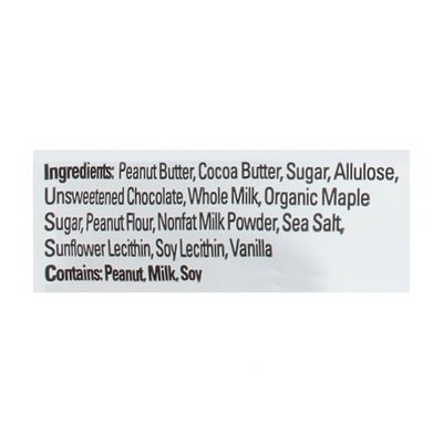 INGREDIENTS: Peanut Butter, Cocoa Butter, Sugar, Allulose, Unsweetened Chocolate, Whole Milk, Organic Maple Sugar, Peanut Flour, Nonfat Milk Powder, Sea Salt, Sunflower Lecithin, Soy Lecithin, Vanilla.