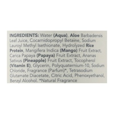 INGREDIENTS: Water (Aqua), Aloe Barbadensis Leaf Juice, Cocamidopropyl Betaine, Sodium Lauroyl Methyl Isethionate, Hydrolyzed Rice Protein, Mangifera Indica (Mango) Fruit Extract, Carica Papaya (Papaya) Fruit Extract, Ananas Sativus (Pineapple) Fruit Extract, Tocopherol (Vitamin E), Glycerin, Polyquaternium-10, Sodium Chloride, Fragrance (Parfum) (Natural Fragrance), Tetrasodium Glutamate Diacetate, Citric Acid, Phenoxyethanol, Benzyl Alcohol.
