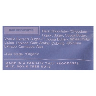 INGREDIENTS: Dark Chocolate (Fair Trade), (Chocolate Liquor, Sugar, Cocoa Butter, Vanilla Extract), Sugar(Fair Trade)(Organic), Cocoa Butter (Fair Trade), Wheat Polar Lipids, Tapioca, Gum Arabic, Coloring (Spirulina Extract), Carnauba Wax.