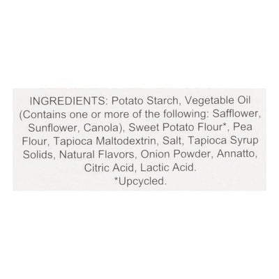 INGREDIENTS: Potato Starch, Vegetable Oil (Contains One or More of the Following: Safflower, Sunflower, Canola), Sweet Potato Flour (Upcycled), Pea Flour, Tapioca Maltodextrin, Salt, Tapioca Syrup Solids, Natural Flavors, Onion Powder, Annatto, Citric Acid, Lactic Acid.
