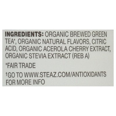 INGREDIENTS: Organic Brewed Green Tea (Fair Trade), Organic Natural Flavors, Citric Acid, Organic Acerola Cherry Extract, Organic Stevia Extract (Reb A).