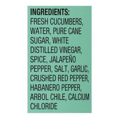 INGREDIENTS: Fresh Cucumbers, Water, Pure Cane Sugar, White Distilled Vinegar, Spices, Jalapeno Pepper, Salt, Garlic, Crushed Red Pepper, Habanero Pepper, Arbol Chile, Calcium Chloride.