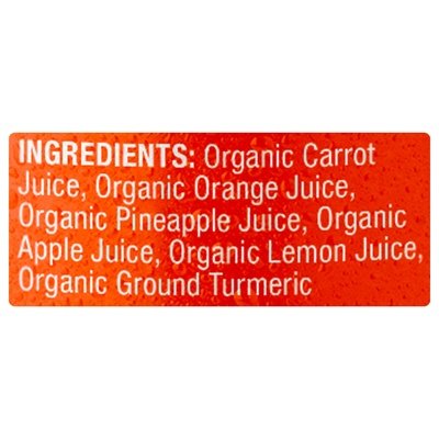 INGREDIENTS: Organic Carrot Juice, Organic Orange Juice, Organic Pineapple Juice, Organic Apple Juice, Organic Lemon Juice Organic Ground Turmeric.