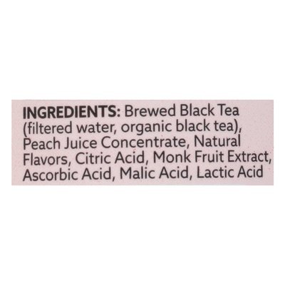 DESCRIPTION: Sweetened by monk fruit. 5 calories. 0 g sugar Gluten free. Vegan. Zero sugar. Contains 24 mg (FWIW, a cup of coffee has 90 mg of caffeine) of caffeine. 100% daily vitamin C. Non-GMO Project verified. nongmoproject.org. For us, it's personal. Our co-founder Jen is a type 1 diabetic, so we created Swoon with a mission to make zero sugar drinks that actually taste good. Nothing artificial. Drink Swoon not sugar. tasteswoon.com. Instagram (at)swoon. Tiktok (at)tasteswoon. Please recycle. < Brewed Black Tea (Filtered Water, Organic Black Tea), Peach Juice Concentrate, Natural Flavors, Citric Acid, Monk Fruit Extract, Ascorbic Acid, Malic Acid, Lactic Acid.