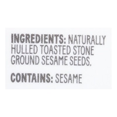 INGREDIENTS: Naturally Hulled Toasted Stone Ground Sesame Seeds.
