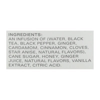 INGREDIENTS: An Infusion of (Water, Black Tea, Black Pepper, Ginger, Cardamom, Cinnamon, Cloves, Star Anise, Natural Flavor), Cane Sugar, Honey, Ginger Juice, Natural Flavors, Vanilla Extract, Citric Acid.