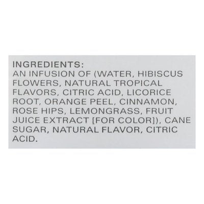 INGREDIENTS: An Infusion of (Water, Hibiscus Flowers, Natural Tropical Flavors, Citric Acid, Licorice Root, Orange Peel, Cinnamon, Rose Hips, Lemongrass, Fruit Juice Extract [for Color]), Cane Sugar, Natural Flavor, Citric Acid.