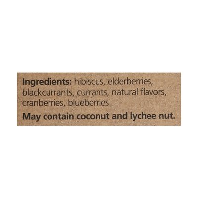 INGREDIENTS: Hibiscus, Elderberries, Blackcurrants, Currants, Natural Flavors, Cranberries, Blueberries.