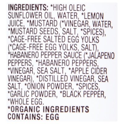 INGREDIENTS: Made with Only These Real Ingredients: High Oleic Sunflower Oil (Organic Ingredients), Water, Lemon Juice (Organic Ingredients), Mustard (Organic Ingredients) (Vinegar [Organic Ingredients], Water, Mustard Seeds [Organic Ingredients], Salt, Spices [Organic Ingredients]), Cage-Free Salted Egg Yolks (Organic Ingredients) (Cage-Free Egg Yolks [Organic Ingredients], Salt), Habanero Peppers Sauce (Organic Ingredients), (Jalapeno Peppers [Organic Ingredients], Habanero Peppers [Organic Ingredients], Vinegar [Organic Ingredients], Sea Salt, Apple Cider Vinegar [Organic Ingredients]), Distilled Vinegar (Organic Ingredients), Sea Salt, Onion Powder (Organic Ingredients), Spices (Organic Ingredients), Garlic Powder (Organic Ingredients), Black Pepper (Organic Ingredients), Whole Egg (Organic Ingredients).
