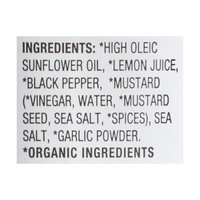 INGREDIENTS: Made with Only These Real Ingredients: (Organic Ingredients) High Oleic Sunflower Oil, (Organic Ingredients) Lemon Juice, (Organic Ingredients) Black Pepper, (Organic Ingredients) Mustard ((Organic Ingredients) Vinegar, Water, (Organic Ingredients) Mustard Seed, Sea Salt, (Organic Ingredients) Spices), Sea Salt, (Organic Ingredients) Garlic Powder.