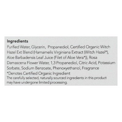 INGREDIENTS: Purified Water, Glycerin, Propanediol, Certified Organic Witch Hazel Ext Blend (Hamamelis Virginiana Extract (Witch Hazel (Denotes Certified Organic Ingredient), Aloe Barbadensis Leaf Juice (Filet of Aloe Vera (Denotes Certified Organic Ingredient))), Rosa Damascena Flower Water, 1.3 Propanediol, Citric Acid, Potassium Sorbate, Sodium Benzoate, Phenoxyethanol, Fragrance.