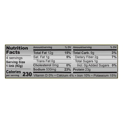 PRODUCT DETAILS: A peppery Polish-style sausage with plenty of onion and garlic. 23 g protein per serving. Certified plant based. Vegan. Non-GMO Project verified. nongmoproject.org. Plant-based. Gets along great with potatoes, red cabbage or sauerkraut. It's also happy in a bun! tofurky.com. Instagram. Facebook. Twitter. Certified B Corporation. Made with in Oregon.