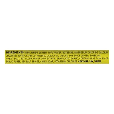 INGREDIENTS: Vital Wheat Gluten, Tofu (Water, Soybeans, Magnesium Chloride, Calcium Chloride), Water, Expeller Pressed Canola Oil, Onions, Soy Sauce (Water, Soybeans, Wheat, Salt), Soy Flour and/or Concentrate, Granulated Garlic, Contains Less than 2% of Garlic Puree, Sea Salt, Spices, Cane Sugar, Potassium Chloride.