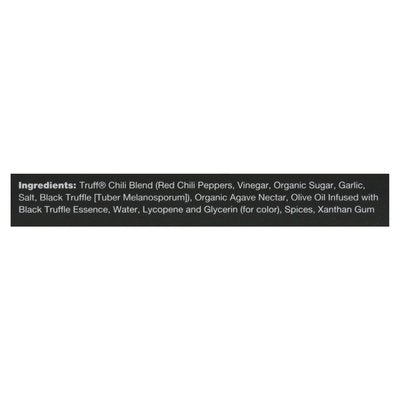 INGREDIENTS: Truff Chili Blend (Red Chili Peppers, Vinegar, Organic Sugar, Garlic, Salt, Black Truffle [Tuber Melanosporum]), Organic Agave Nectar, Olive Oil Infused with Black Truffle Essence, Water, Lycopene and Glycerin (for Color), Spices, Xanthan Gum.