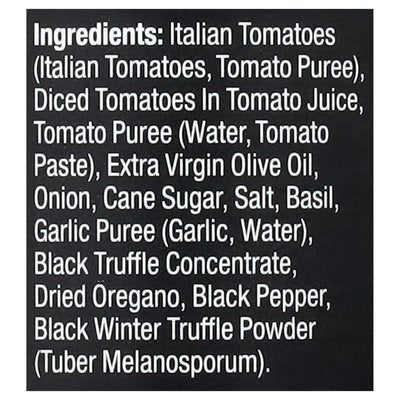 INGREDIENTS: Italian Tomatoes (Italian Tomatoes, Tomato Puree), Diced Tomatoes in Tomato Juice, Tomato Puree (Water, Tomato Paste), Extra Virgin Olive Oil, Onion, Cane Sugar, Salt, Basil, Garlic Puree (Garlic, Water), Black Truffle Concentrate, Dried Oregano, Black Pepper, Black Winter Truffle Powder (Tuber Melanosporum).