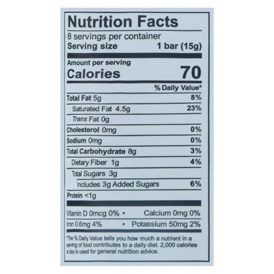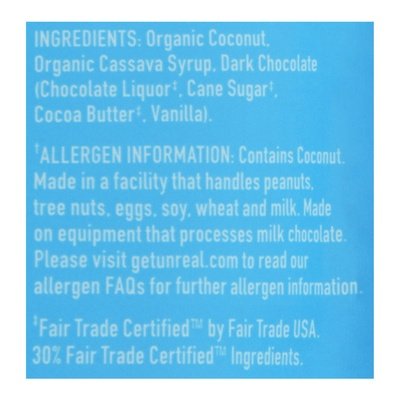 INGREDIENTS: Organic Coconut, Organic Cassava Syrup, Dark Chocolate (Chocolate Liquor (Fair Trade Certified by Fair Trade USA 30% Fair Trade Certified Ingredients), Cane Sugar (Fair Trade Certified by Fair Trade USA 30% Fair Trade Certified Ingredients), Cocoa Butter (Fair Trade Certified by Fair Trade USA 30% Fair Trade Certified Ingredients), Vanilla).