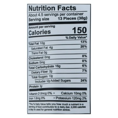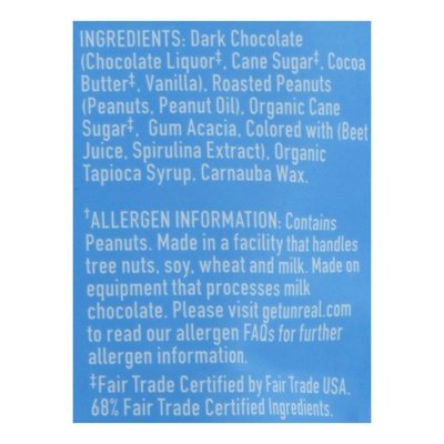 INGREDIENTS: Dark Chocolate (Chocolate Liquor (Fair Trade Certified by Fair Trade USA 68% Fair Trade Certified Ingredients), Cane Sugar (Fair Trade Certified by Fair Trade USA 68% Fair Trade Certified Ingredients), Cocoa Butter (Fair Trade Certified by Fair Trade USA 68% Fair Trade Certified Ingredients), Vanilla), Roasted Peanuts (Peanuts, Peanut oil), Organic Cane Sugar (Fair Trade Certified by Fair Trade USA 68% Fair Trade Certified Ingredients), Gum Acacia, Colored with (Beet Juice, Spirulina Extract), Organic Tapioca Syrup, Carnauba Wax.
