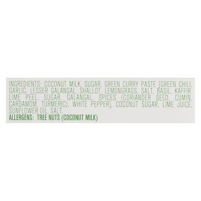 INGREDIENTS: Coconut Milk, Sugar, Green Curry Garlic, Lesser Galangal, Shallot, Lemongrass, Paste [Green Chili, Salt, Basil, Kaffir (Coriander Seed, Cumin, Lime Peel, Sugar, Galangal, Spices Cardamom, Turmeric), White Pepper], Coconut Sugar, Lime Juice, Sunflower Oil, Salt.