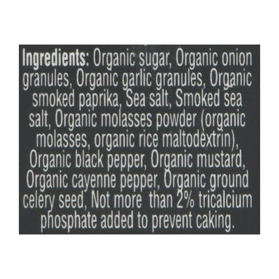 INGREDIENTS: Organic Sugar, Organic Onion Granules, Organic Garlic Granules, Organic Smoked Paprika, Sea Salt, Smoked Sea Salt, Organic Molasses Powder (Organic Molasses, Organic Rice Maltodextrin), Organic Black Pepper, Organic Mustard, Organic Cayenne Pepper, Organic Ground Celery Seed, Not More than 2% Tricalcium Phosphate Added to Prevent Caking.