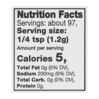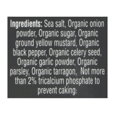 INGREDIENTS: Sea Salt, Organic Onion Powder, Organic Sugar, Organic Ground Yellow Mustard, Organic Black Pepper, Organic Black Pepper, Organic Celery Seed, Organic Garlic Tarragon, Not More than 2% Tricalcium Phosphate to Prevent Caking.