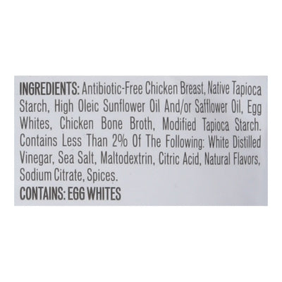 INGREDIENTS: Antibiotic-Free Chicken Breast, Native Tapioca Starch, High Oleic Sunflower Oil and/or Safflower Oil, Egg Whites, Chicken Bone Broth, Modified Tapioca Starch, Sugar, Contains Less than 2% of the Following, White Distilled Vinegar, Sea Salt, Maltodextrin, Citric Acid, Natural Flavors, Sodium Citrate, Spices.