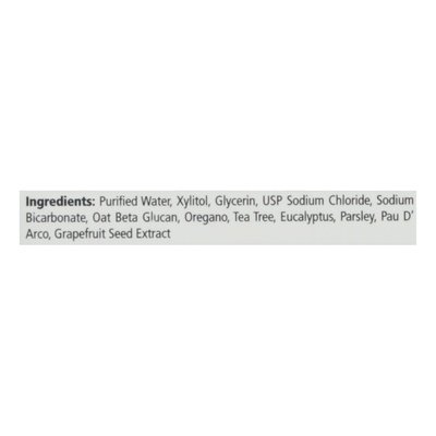 INGREDIENTS: Purified Water, Xylitol, Glycerin, Sodium Chloride, Sodium Bicarbonate, Oat Beta Glucan, Oregano, Tea Tree, Eucalyptus, Parsley, Pau D'arco, Grapefruit Seed Extract.
