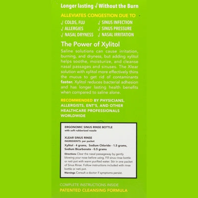 PRODUCT DETAILS: Drug free. 3x the power with xylitol. Alleviates the primary cause of congestion. For allergy, cold and flu symptoms. 6 Sinus rinse packets (with xylitol). 1 Sinus rinse bottle (holds 10 fl oz). Longer lasting without the burn. Alleviates Congestion Due to: colds, flu; sinus infection; allergies; sinus pressure; nasal dryness; nasal irritation. The power of Xylitol: Saline solutions can cause irritation, burning and dryness, but adding xylitol helps soothe, moisturize, and cleanse nasal passages and sinuses. The Xlear solution with xylitol more effectively thins the mucus to get rid of contaminants faster. Xylitol reduces bacterial adhesion and has longer lasting health benefits when compared to saline alone. Recommended by Physicians, Allergists, ENT's, and other Healthcare professionals worldwide. Ergonomic sinus rinse bottle with soft rubberized nozzle. Patented cleansing formula. Doctor recommended. Xlear Sinus Care: 2 grams of salt and sodium bicarbonate, with the added benefits of 4 grams of Xylitol. Other brands: 2 grams of salt and sodium bicarbonate, no Xylitol. A more effective solution. More soothing, no burn. More effective than other brands. Alleviates the primary cause of congestion, saline alone doesn't - More effective. America's No.1 Best Selling: We make America's best selling natural Xylitol Nasal Spray. Money Back Guarantee: If you are not satisfied with the results, return for a full refund. xlear.com. Share your story at (hashtag)imXlear. Customer Service: 1 877 599 5327. xlear.com. Also try our convenient Xlear Nasal Sprays for adults, kids, and infants. BPA-free. Manufactured in China and USA. Inspected in USA.