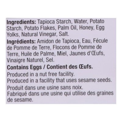 INGREDIENTS: Tapioca Starch, Water, Potato Starch, Potato Flakes, Palm Oil, Honey, Egg Yolks, Natural Vinegar, Salt.