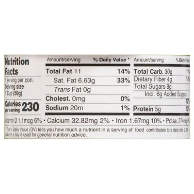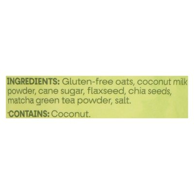 INGREDIENTS: Gluten-Free Oats, Coconut Milk Powder, Cane Sugar, Flaxseed, Chai Seeds, Matcha Green Tea Powder, Salt.