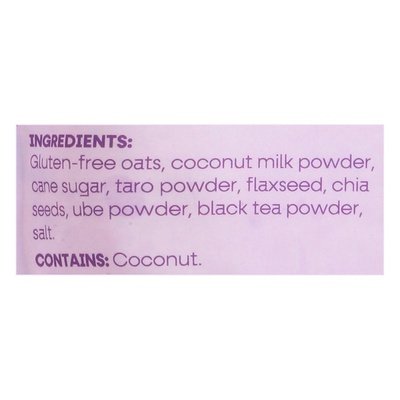 DESCRIPTION: Taro, black tea, chia, coconut milk, & flaxseed. Per 40 g Serving: 3 g plant protein. 4 g fiber. 100% Gluten free. Vegan. Tested and confirmed Gluten-Free in our quality control laboratory. Caffeine per serving: 38 mg, about 1/3 cup of coffee. Non-GMO Project verified. nongmoproject.org. Yishi is inspired by hot cereal my mother made for me during my childhood in China, with ingredients lovingly chosen to provide wellness. After moving to the U.S., I created Yishi to honor my mother's thoughtful approach to food and share my Asian heritage. Based on my favorite midday drink, this oatmeal is packed with sweet-potatoey taro, creamy coconut, and black tea. Along with satisfying the sweet tooth, our Taro Bubble Tea Oatmeal offers protein, fiber, and caffeine. I hope it makes your day! Lin Jiang, Founder yishifoods.com. TikTok. Instagram (at)yishifoods. Women owned. Made in USA. < Gluten-Free Oats, Coconut Milk Powder, Cane Sugar, Taro Powder, Flaxseed, Chia Seeds, Ube Powder, Black Tea Powder, Salt.