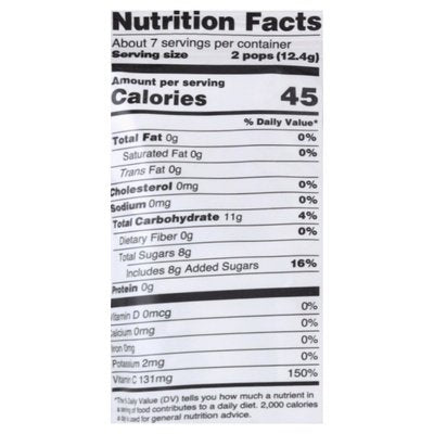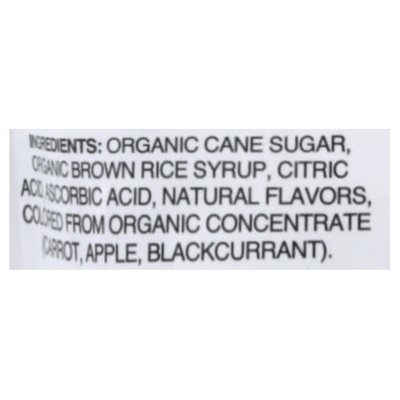 INGREDIENTS: Organic Cane Sugar, Organic Brown Rice Syrup, Citric Acid, Ascorbic Acid, Natural Flavors, Colored from Organic Concentrate (Carrot, Apple, Blackcurrant).