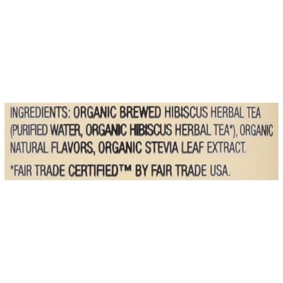 INGREDIENTS: Organic Brewed Hibiscus Herbal Tea (Purified Water, Organic Hibiscus Herbal Tea (Fair Trade Certified by Fair Trade USA. Over 80% Fair Trade Certified Ingredients), Organic Natural Flavors, Organic Stevia Leaf Extract.